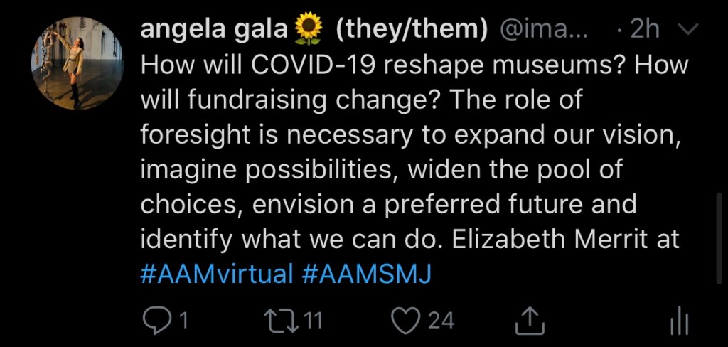 Un’altra delle mie sessioni preferite è stata quella guidata dalla direttrice del Centro per il futuro dei musei Elizabeth Merritt, che ci ha fornito diversi scenari (finanziari) per i musei dopo la pandemia, invitandoci a considerare chi valorizza i musei oggi e perché, poiché è da lì che provengono i fondi ed è quello che presto determinerà la posizione che assumeranno i musei nel mondo.